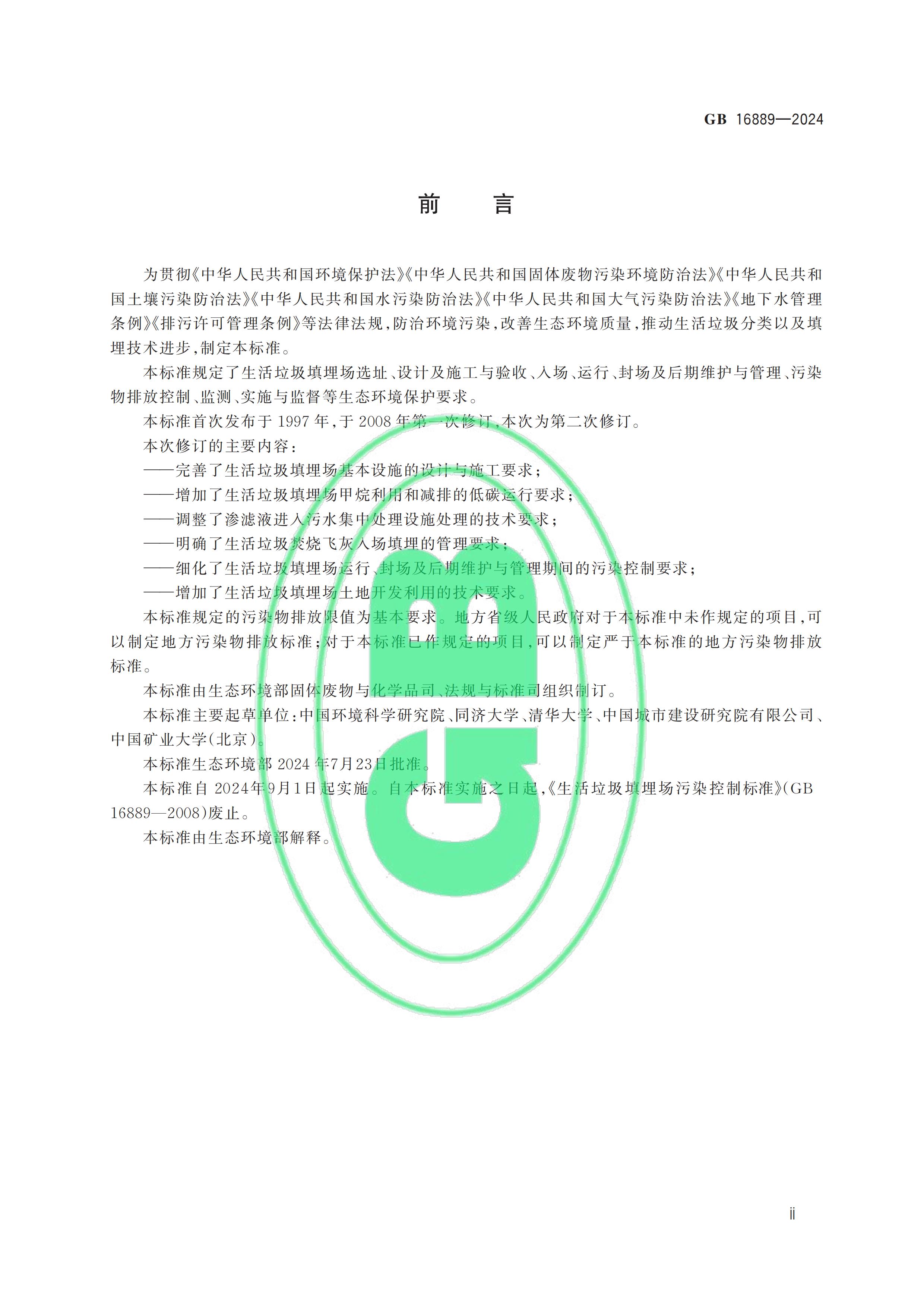 從“全國標準信息公共服務平臺”獲悉,國家標準《生活垃圾填埋場污染控制標準》(GB 16889-2024)已于2024年7月24日正式發布,新標準將替代原先的GB 16889-2008,于2024年9月1日起正式實施。以下是GB 16889-2024標準全文: