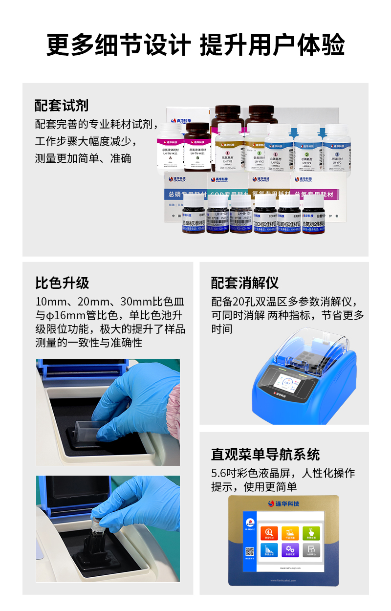 簡要描述: 儀器符合《HJ924-2017COD光度法快速測定儀技術要求及檢測方法》,所有檢測項目依據國家行業標準:COD-《HJ/T399-2007》、氨氮-《HJ535-2009》、總磷-《GB11893-89》。可測定化學需氧量(COD)、氨氮、總磷、總氮、懸浮物、色度(鉑鈷色系)、濁度、重金屬、有機污染物和無機污染物等多項指標,濃度直讀。