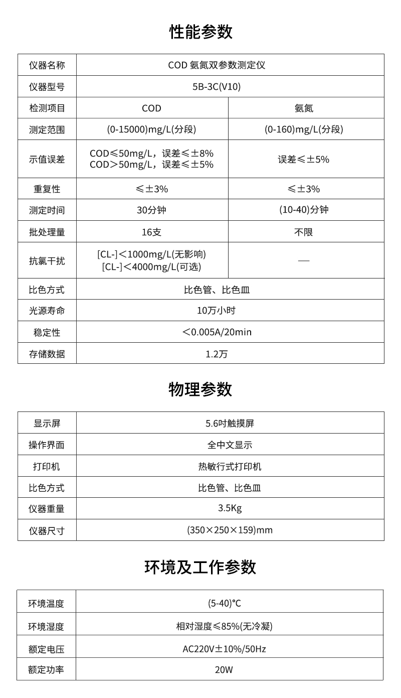 1、COD氨氮雙參數:直接測定化學需氧量(COD)、氨氮,內置多種方法曲線,濃度直讀;