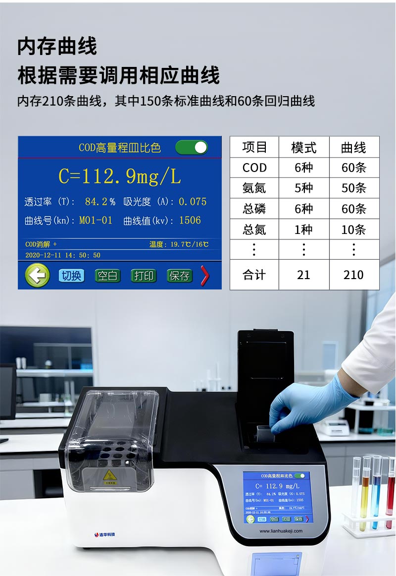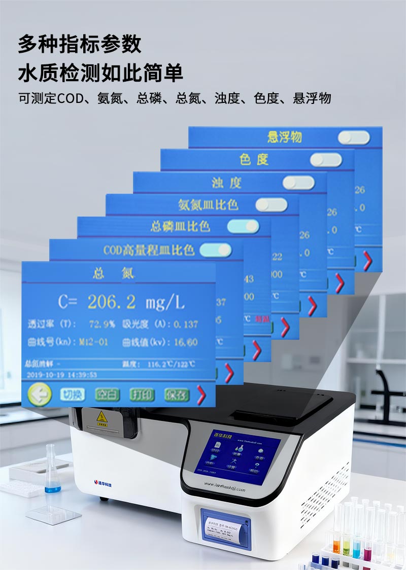 簡要描述: 儀器符合《HJ924-2017COD光度法快速測定儀技術要求及檢測方法》,所有檢測項目依據國家行業標準:COD-《HJ/T399-2007》、氨氮-《HJ535-2009》、總磷-《GB11893-89》。經典的消解比色一體型,采用多光路無干涉系統,支持皿/管比色,可測定7項高頻水質檢測指標。